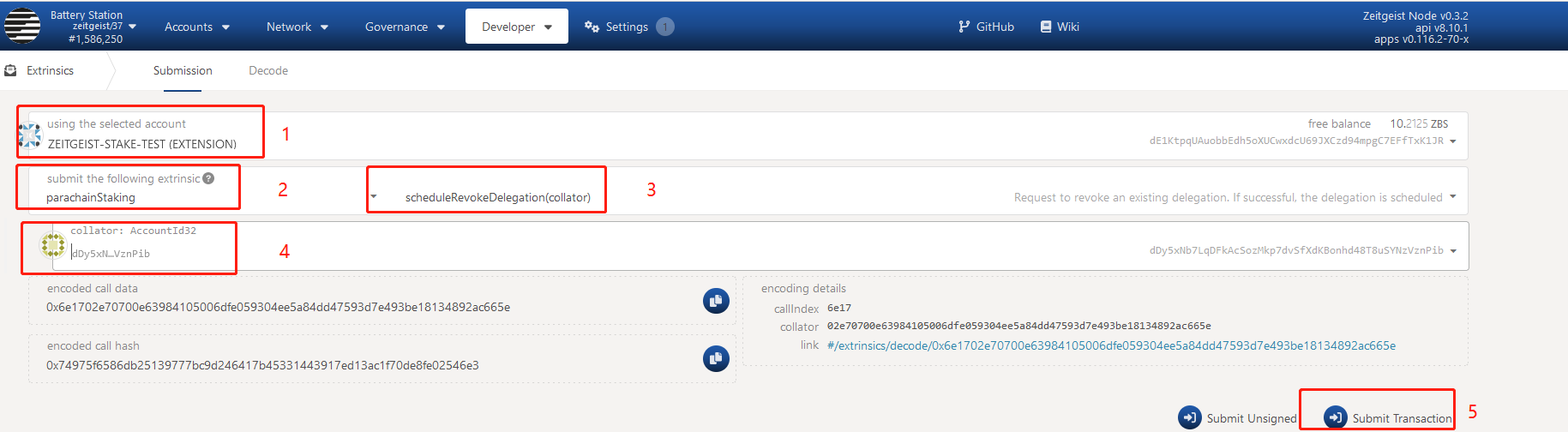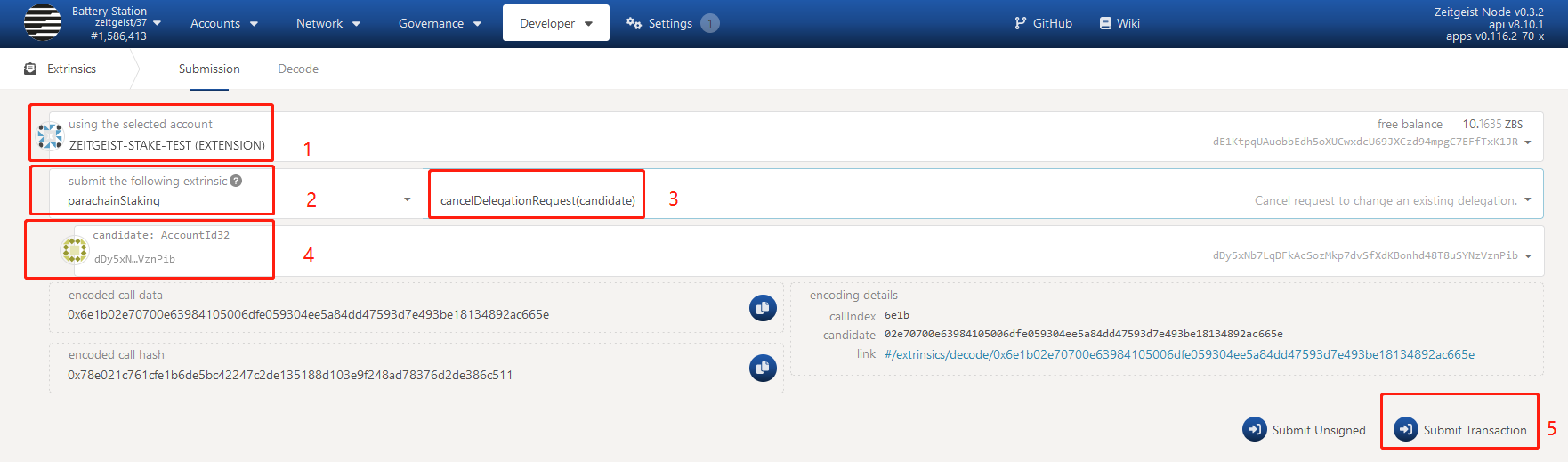 3. Choose the cancelDelegationRequest or the cancelLeaveDelegators, depending on whether your scheduled the request via scheduleRevokeDelegation or scheduleLeaveDelegators