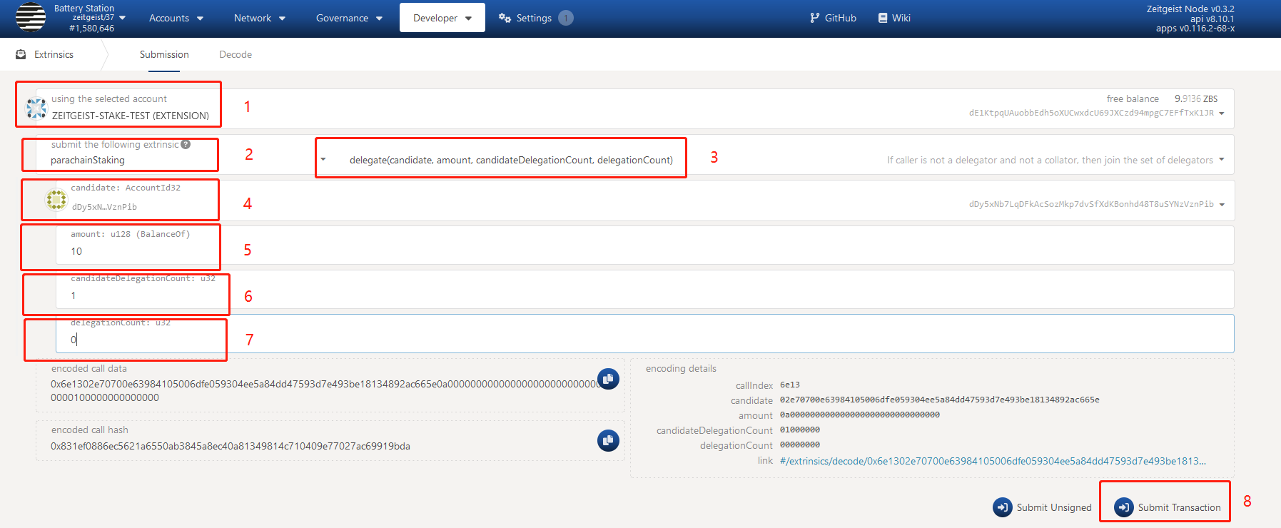 3. Choose delegate(candidate, amount, candidateDelegationCount, delegationCount)